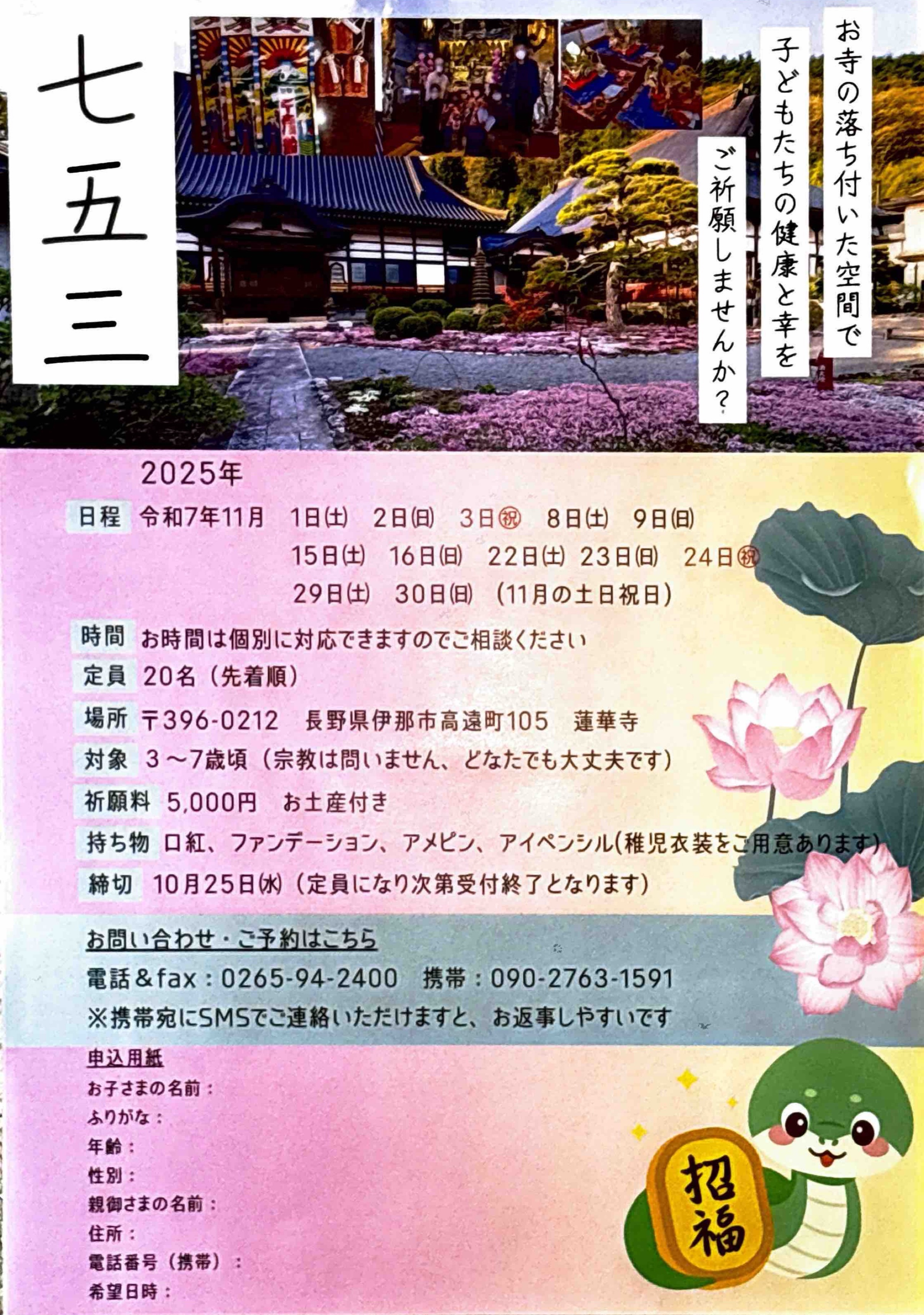 ![]() 當山では、恒例の「七五三祈願」を下記のように行います。 この機会に、お子様の身体健康・無病息災をご祈念されてはいかがでしょうか。 稚児の衣装を身に着けての御祈祷は一味違う、非日常体験でもあり、 お子さんにも、ご家族の記憶にもしっかりの残ることでしょう。 地域、ご親戚、お知り合いの方に対象となるお子様がいらっしゃいましたら、 是非、おすすめください。 ご家族皆さんで、ご祈念、お祝いいたしましょう。 |